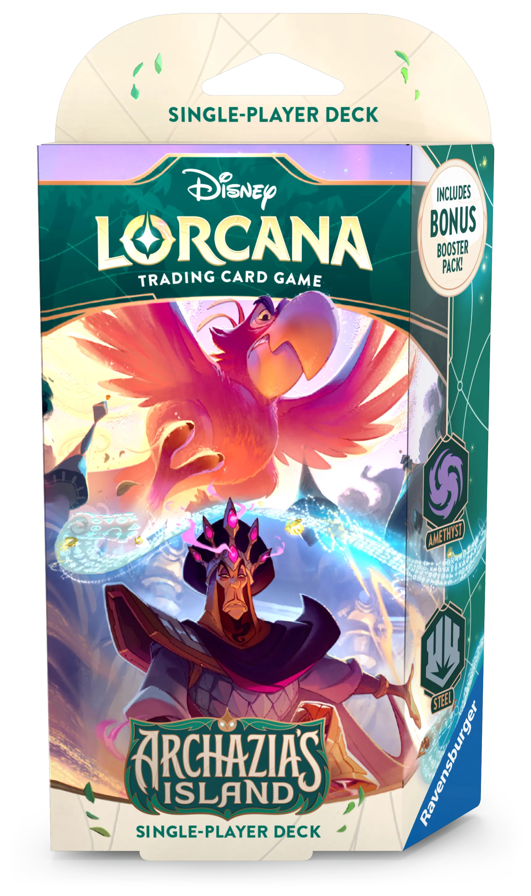 Two Single-Player Decks are available for the Disney Lorcana TCG set Archazia’s Island. Each prebuilt deck has 60 cards and features cards from two inks, each with distinct play styles. The two ink combinations are Amethyst & Steel and Ruby & Sapphire.