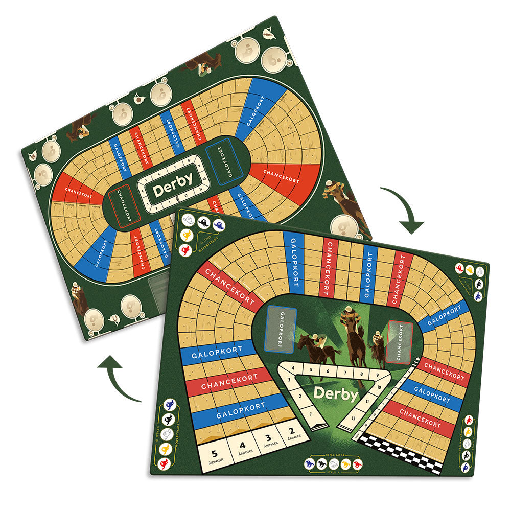 Med både Klassisk Derby og Moderne Derby i samme æske kan du vælge mellem den nostalgiske spiloplevelse eller en hurtigere, mere kompakt variant. Den dobbeltsidede spilleplade gør det nemt at skifte mellem de to – perfekt til både garvede spillere og nye ryttere i sadlen.