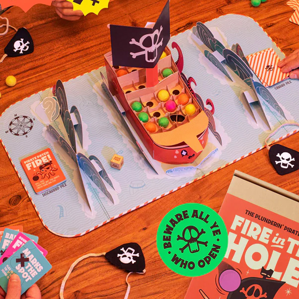 Fire In The Hole – Skyd, scor og plyndr på det vildeste piratskib! Et spil med dygtighed, list – og et kæmpe pop-up skib midt på bordet!